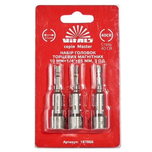 Набір головок торцевих магнітних 10 мм 1/4"х65 мм, 3 од. Vitals - це набір інструментів, який використовується для роботи з гвинтами та гайками на різних металевих поверхнях. Виготовлений зі сталі 40CR, що забезпечує йому високу міцність та довговічність. Довжина головок становить 65 мм, а робочий розмір - 10 мм. Посадковий квадрат має розмір 1/4", що забезпечує зручне та надійне кріплення головок до ручок інструменту.