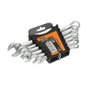 Набір ключів комбінованих Cr-V сатин має робочий розмір від 8 до 17 мм. Він виготовлений з хром-ванадієвої сталі посиленої міцності, що забезпечує йому довговічність і надійність. Ключі мають пряму форму, що дозволяє зручно виконувати ремонтні роботи.