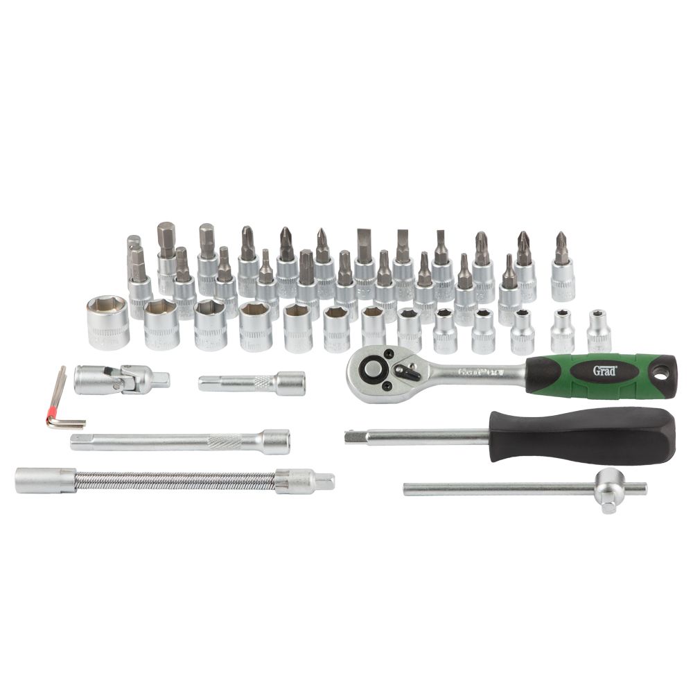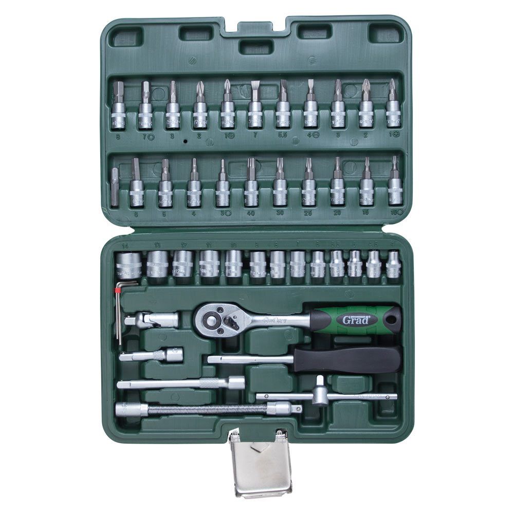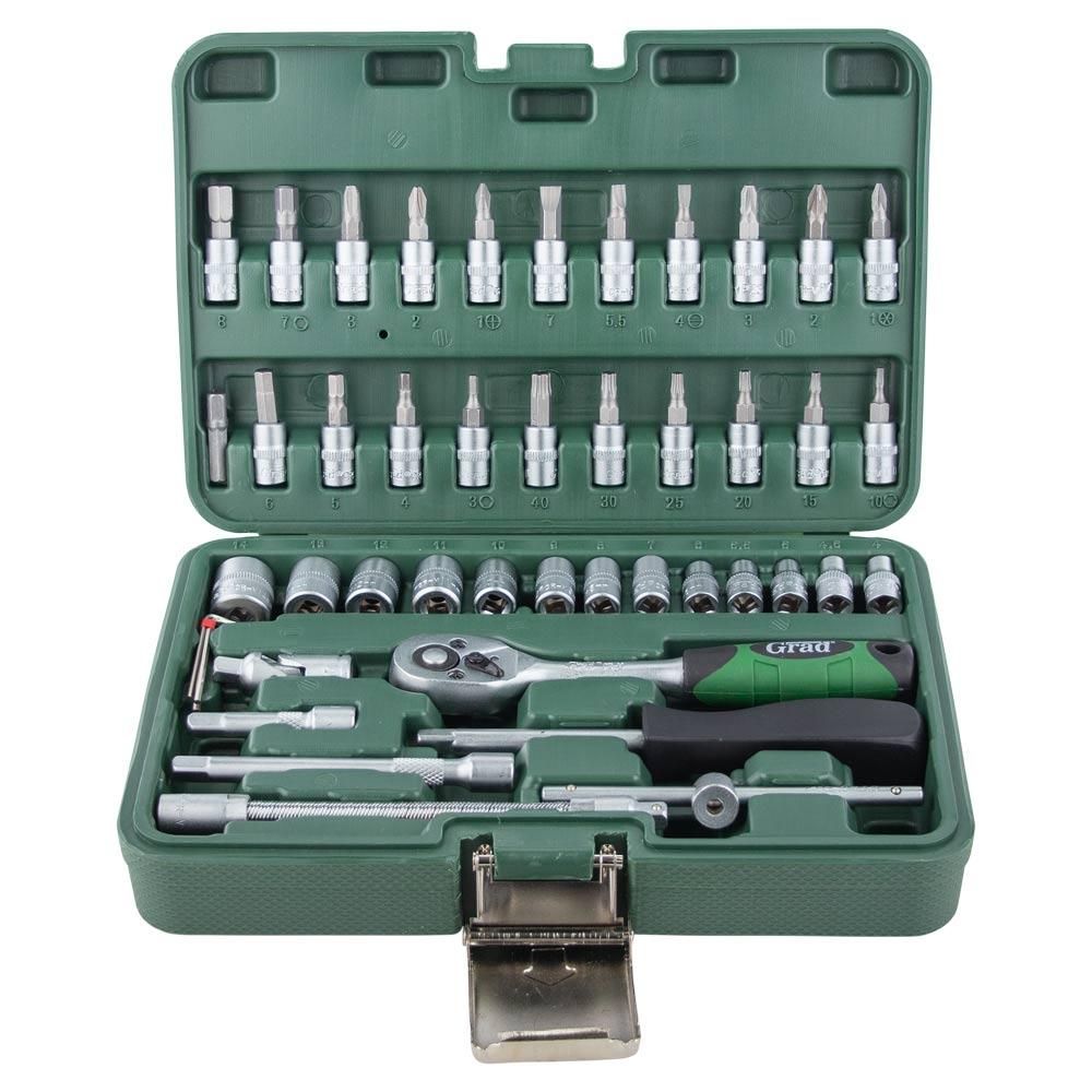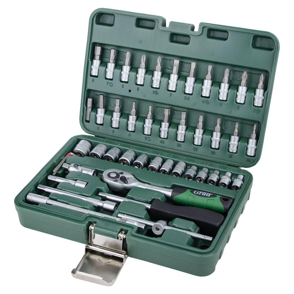 Набори GRAD - лінійка для побутового використання. Набори підходять як для виконання нескладного автомобільного ремонту, так і для побутового застосування. Інструменти виготовлені з міцної інструментальної сталі і мають тришарове покриття (Nickel X2 + Chrome). Для комфортного зберігання та транспортування, набори поставляються в кейсі, який виготовлений з міцного АБС-пластику з металевими замками.