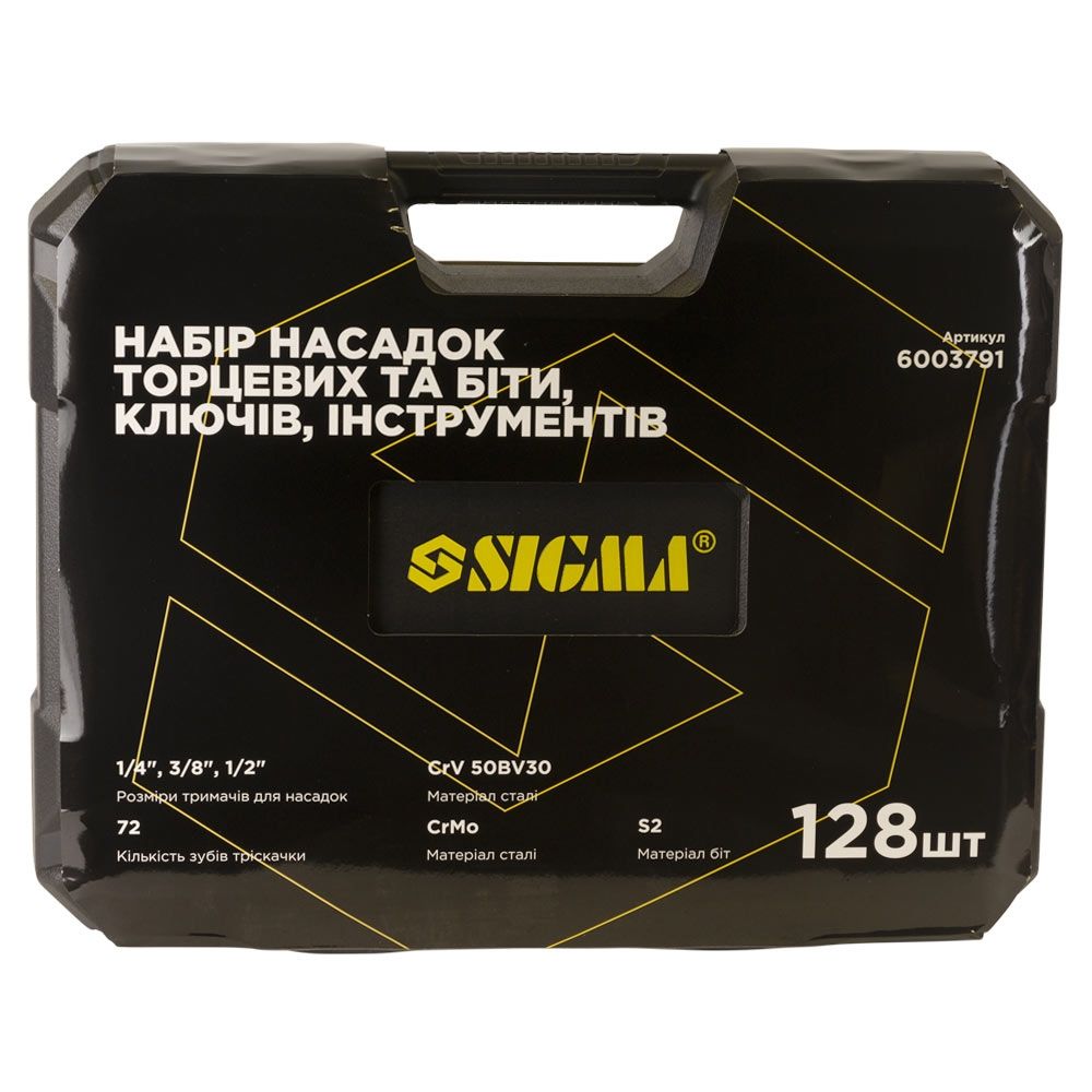 Набір насадок торцевих, біт, ключів та інструментів SIGMA 1/4", 3/8", 1/2" (128 шт) призначений для робіт з різьбовими з’єднаннями під час ремонту та обслуговування автомобілів, а також для широкого спектра слюсарно-столярних задач. Універсальна комплектація з тріскачками трьох розмірів, ударними головками, комбінованими та шестигранними ключами, додатковими пристроями та аксесуарами дозволяє виконувати як типові, так і спеціалізовані операції. Набір підходить для напівпрофесійного та побутового використання.
