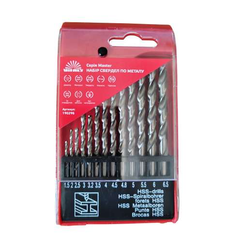 Набір свердл по металу HSS 4341 13 од. 1.5–6.5 мм Vitals Master - це надійні та якісні свердла, виготовлені зі сталі HSS 4341, яка є аналогом P6M5. Вони відповідають стандарту DIN 338 і мають твердість ріжучого леза 63-65 HRC. Цей набір складається з 13 свердел різних діаметрів від 1.5 мм до 6.5 мм. Використання цих свердел дозволяє зручно та ефективно просвердлити отвори в металевих поверхнях без пошкодження інструменту.