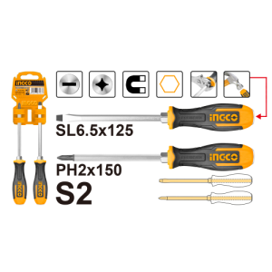 Додаткові унікальні властивості і переваги набору викруток 2 шт. INGCO INDUSTRIAL: антикорозійне покриття для захисту від ушкоджень, мале сопротивление на скользящих поверхностях, можливість заміни біти викруток для забезпечення різних видів робіт.