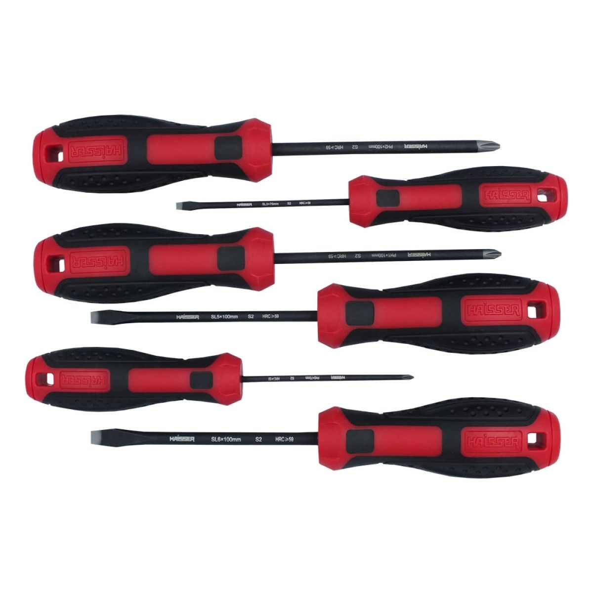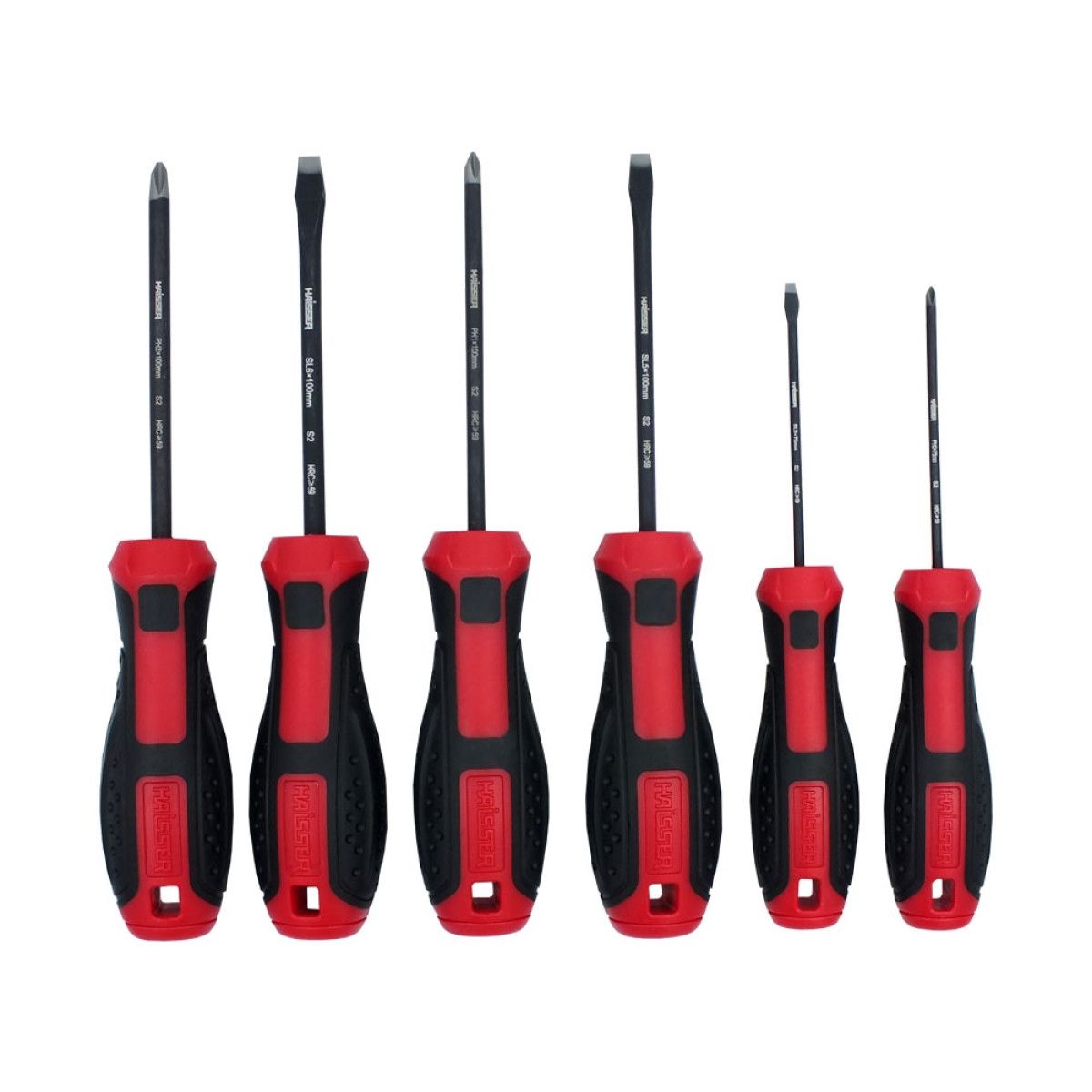 Набір викруток HAISSER має стандартний тип і складається з 6 штук. Викрутки мають різні типи наконечників: плоскі (SL) і хрестові (PH). Довжина робочого стрижня варіюється від 75 до 150 мм. Номери шліців відповідають кожному типу наконечника: 0, 1, 2, 3, 5, 6. Наконечники мають магнітну властивість для збереження дрібних деталей. Ручки виготовлені з пластику і мають гумове покриття, що забезпечує комфортну і надійну фіксацію в руці.