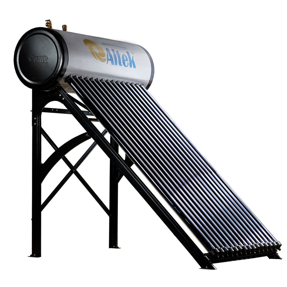 Сонячні водонагрівачі Altek дають змогу ефективно акумулювати сонячне випромінювання, перетворюючи його в корисну теплову енергію у вигляді гарячої води для побутових потреб. Сонячний водонагрівач Altek SP-H1-15 дозволяє отримувати гарячу воду під тиском водопроводу влітку. Можлива експлуатація і взимку, але за умови автоматичної підтримки температури в баку електричним ТЕНом, належного утеплення та додаткового підігріву трубопроводу. Допускається короткочасна експлуатація водонагрівача Altek SP-H1-15 у період короткочасних морозів до -30 °C, Характеристики: Кількість трубок — 15 штук; Об’єм системи — 113 літрів; Площа апертури — 1,41 кв.м; Площа абсорбера — 1,21 кв.м; Діаметр бака — 470 мм; Система зберігає гарячу воду впродовж 48-72 годин; Витримує тиск 6 бар; Втрата температури води — 4°С-8°C на добу; Загальна вага заповненою водою системи — 189 кг. Переваги: Застосовуються трубки Heat pipe (AlN/AlN-SS/Cu) — в середині не містять води; Всередині трубки алюмінієві пластини, між якими розташований мідний теплопровідний стрижень, який і передає тепло від трубки до води в баку; Система є стійкою до вітрів та граду; Система може працювати навіть після виходу з експлуатації кількох трубок; Можливість розташувати систему як на даху та і на землі; Можна під'єднати подачу води від міського водопроводу; Мікропроцесорне керування системою за допомогою контролера; Анодний захист; Система не потребує застосування помпи. У жодному разі не слід використовувати сонячний водонагрівач для підігріву та зберігання будь-яких інших речовин і матеріалів крім звичайної питної води.