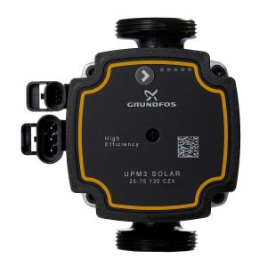 Насос Grundfos UPM3 Solar 25-75 випускається у Франції та призначений для роботи в теплових геліосистемах. Дана модель циркулярного насоса з мокрим ротором відрізняється високою ефективністю використання електроенергії та гарною продуктивністю, що робить його одним із найкращих пристроїв для роботи в солярних системах ГВП. Однією з головних переваг даної моделі є можливість підключати зовнішні пристрої управління з ШІМ (профіль С), але також можливість експлуатації в режимі постійної кривої без використання зовнішніх схем управління. Частота обертання має 3 ступені регулювання. Корпус пристрою виготовлений із сірого чавуну, в якому розташований ротор із нержавіючої сталі, що спирається на металографічні підшипники. При цьому власна вага пристрою становить лише 1,9 кг. Для виготовлення робочого колеса використані тільки хімічно інертні та стійкі до високих температур синтетичні матеріали, що забезпечує чистоту рідини, що перекачується. Такий вибір матеріалів та конструктивного рішення дозволяє тривалий час експлуатувати насос без погіршення його технічних характеристик та появи відмов. Розміри установки Grundfos UPM3 Solar 25-75 (довжина) становлять 130 мм. Допускається як горизонтальна, і вертикальна установка. Для підключення до системи застосовуються різьбові з'єднання G1½". Для спрощення монтажу та підключення до електричних кіл в комплект постачання входять кабель живлення та кабель PWM управління. Grundfos UPM3 Solar 25-75 забезпечує тиск рідини 7,5 м при продуктивності до 3,4 м3/год. При цьому споживана потужність складає всього від 2 до 45 Вт при напрузі живлення 220 50 Гц. Температура рідини, що перекачується, повинна знаходитися в межах то +2 до +110°C, але допустимо короткочасне підвищення температури до значення +130°C.