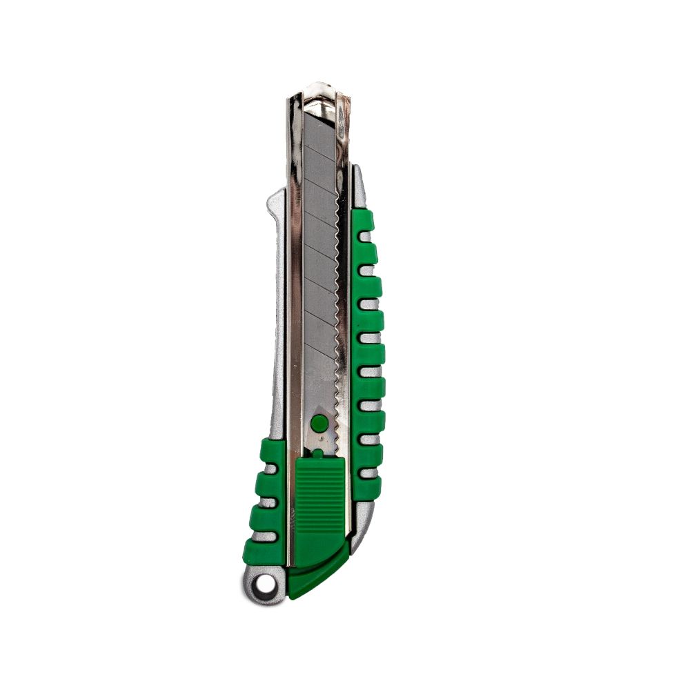 Автоматичний фіксатор дозволяє легко та швидко замінювати або фіксувати лезо. Лезо шириною 18 мм виготовлене з японської сталі SK2 – однієї з найміцніших і найгостріших марок сталі, з твердістю 62–64 HRC. Використовується для різання гіпсокартону, паперу, дерева та інших нетвердих матеріалів.