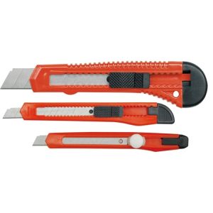 Ножі пістолетні VOREL - це набір з трьох ножів, які мають сегментоване лезо і призначені для оздоблювальних робіт. Ручки ножів виготовлені з пластику, що забезпечує комфортне утримання і зручну роботу з ними. Цей набір ножів є незамінним інструментом для будівельників, майстрів по ремонту і дизайнерів, які займаються оздоблювальними роботами. Вони дозволяють легко і швидко виконувати різні різальні роботи, такі як різання картону, обрізка плівки, вінілу та інших матеріалів. Крім того, ножі пістолетні VOREL мають зовнішню затискну систему, завдяки чому зміна леза є простою і безпечною.