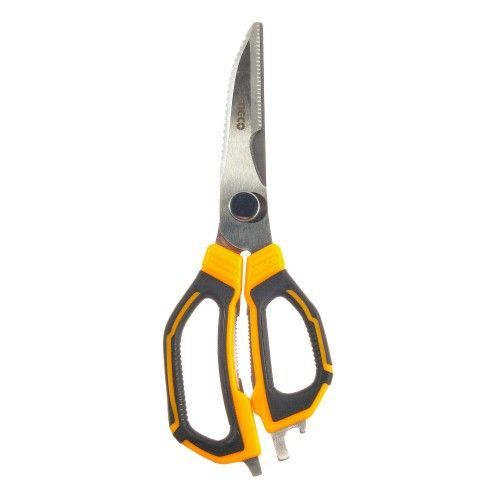 Універсальні мультифункціональні ножиці INGCO довжиною 225 мм виготовлені з нержавіючої сталі. Ці ножиці мають велику частоколку, що дозволяє легко різати різноманітні матеріали, такі як папір, картон, тканина, шпон, гума тощо. Їх зручна ручка забезпечує комфортну роботу і міцне тримання в руках. Такі ножиці можна використовувати як у побутових цілях, так і у промисловості або професійній сфері.
