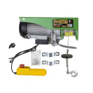 Procraft TP500 - надійний тельфер-підйомник.Він призначений для роботи в переміщенні і для підйому вантажів (вага - до 250 кілограмів, без блоків, і 500 кг - з блоками). Таль агрегату складається з редуктора, електричного двигуна, гальмівного барабана (канатного), вантажного троса, який виконаний зі сталі, підвіски у формі гака і пускової апаратури.