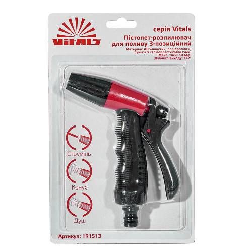 Пістолет-розпилювач 3-позиційний Vitals забезпечить вам комфортне поливання вашого саду чи городу. Виготовлений з високоякісного ABS-пластику та TPR, він володіє високою міцністю і довговічністю. Також має 3 режими регулювання струменя, що робить його універсальним і зручним використовувати. Діаметр підключення - 1/2".
