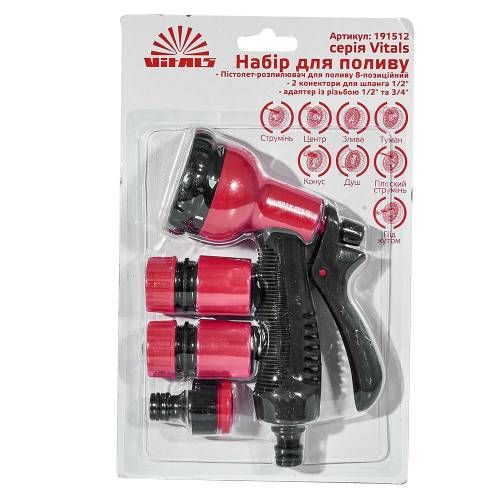Пістолет-розпилювач 8-позиційний з адаптером та конекторами для шланга Vitals - це зручне та потужне знаряддя для поливу вашого саду чи городу. Виготовлений з високоякісного ABS-пластику та TPR матеріалу, цей пістолет-розпилювач гарантує довгий термін служби та високу міцність. Завдяки восьми режимам струменя, ви можете вибрати оптимальний тип поливу для вашого саду - від легкого туману до сильного потоку. Також в комплекті йде адаптер з різьблом 1/2” та 3/4”, що дозволяє підключити пістолет-розпилювач до будь-якого шланга з відповідним розміром гнізда.