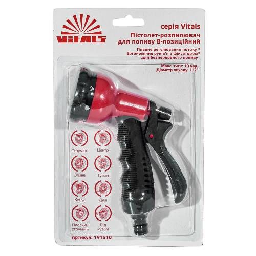 Основні переваги пістолета-розпилювача 8-позиційного пластикового Vitals:- 8 режимів струменя для зручного і точного поливу- Виконаний з високоякісного ABS-пластику та TPR, що гарантує довговічність та стійкість до корозії- Легке підключення за стандартом 1/2"- Зручна рукоятка для комфортного користування- Ідеально підходить для поливу рослин на городі, у саду, на дачі або в горщиках