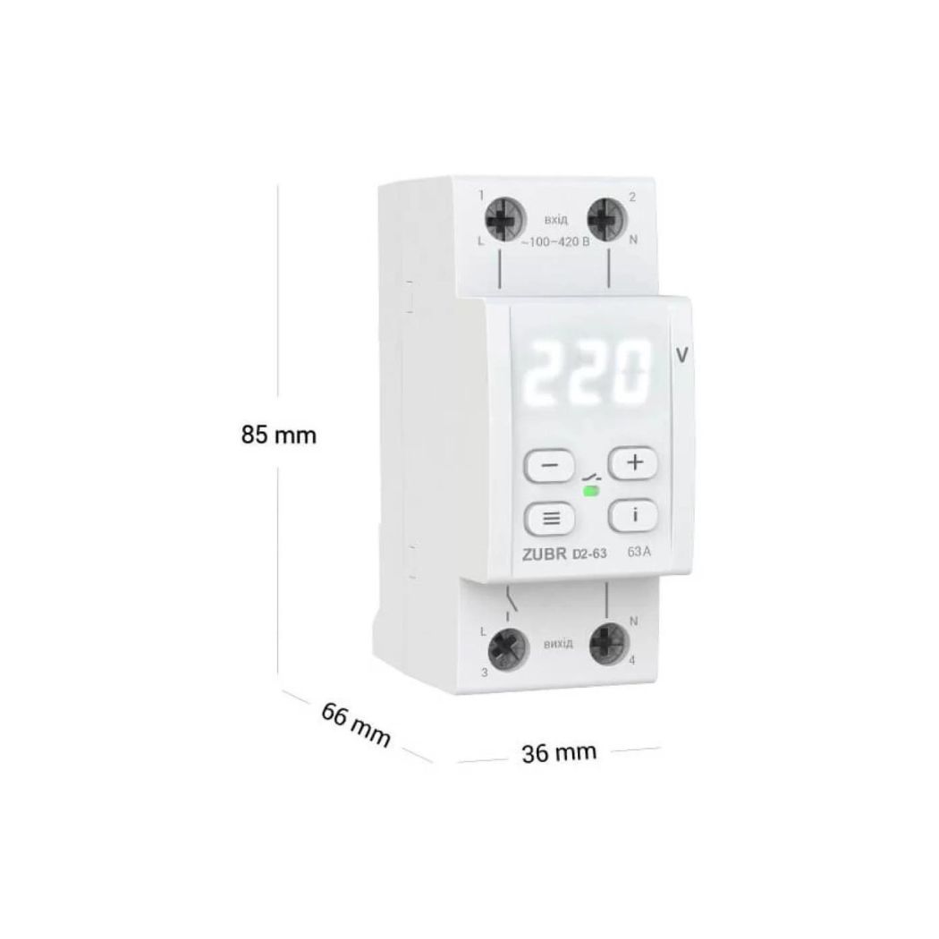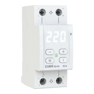 ZUBR D2 — це компактне однофазне реле напруги, розроблене для надійного захисту побутових і промислових електроприладів від небезпечних перепадів напруги в мережі 230 В. Пристрій автоматично відключає навантаження у разі аварійної ситуації, запобігаючи пошкодженню техніки, та має вбудований захист від перегріву.