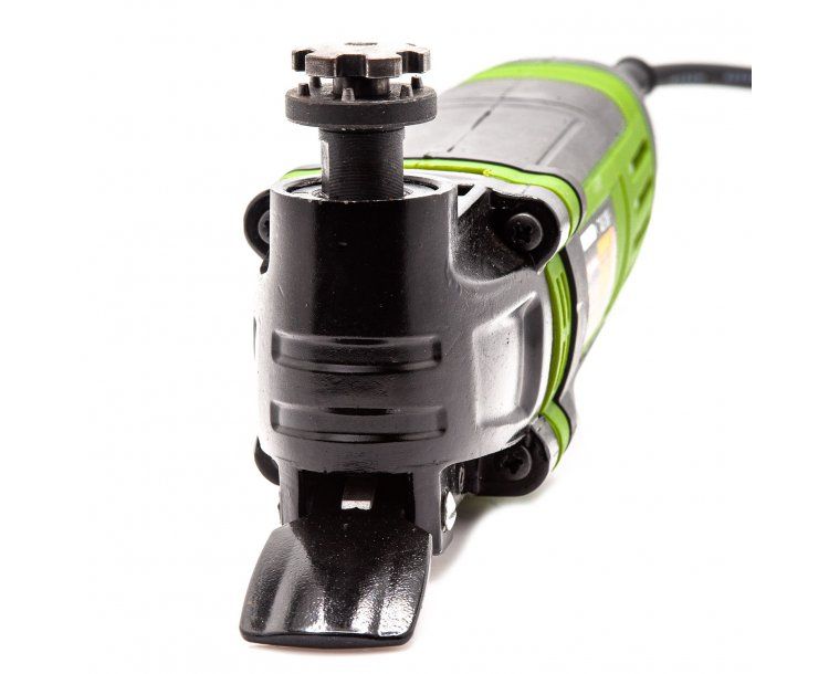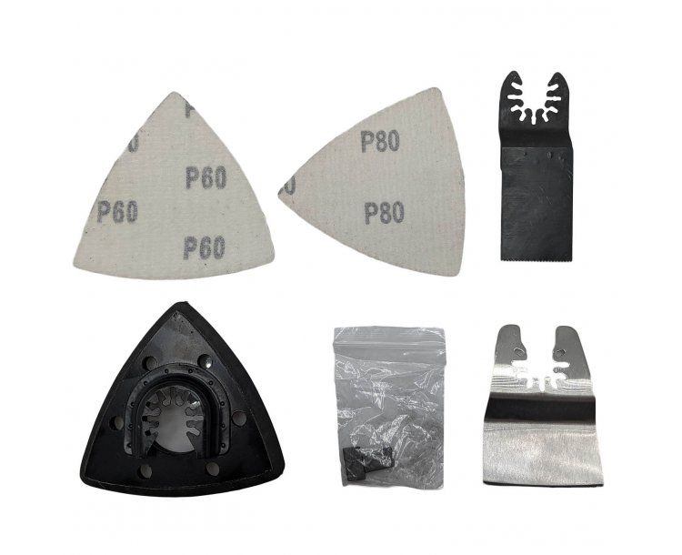 В комплекті з інструментом є три різні насадки: пряме пиляльне полотно для різання деревини, м'якого металу і пластику, напівкругле пиляльне полотно для зняття підлогового покриття і дельташліфувальна платформа для полірування;