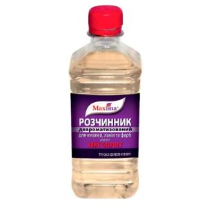 Розчинник деароматизований Maxima — це універсальний органічний розчинник без різкого запаху, призначений для розведення лакофарбових матеріалів, очищення інструментів і знежирення поверхонь. Завдяки зниженому вмісту ароматичних вуглеводнів є менш токсичним і безпечнішим у використанні, ніж звичайні розчинники.