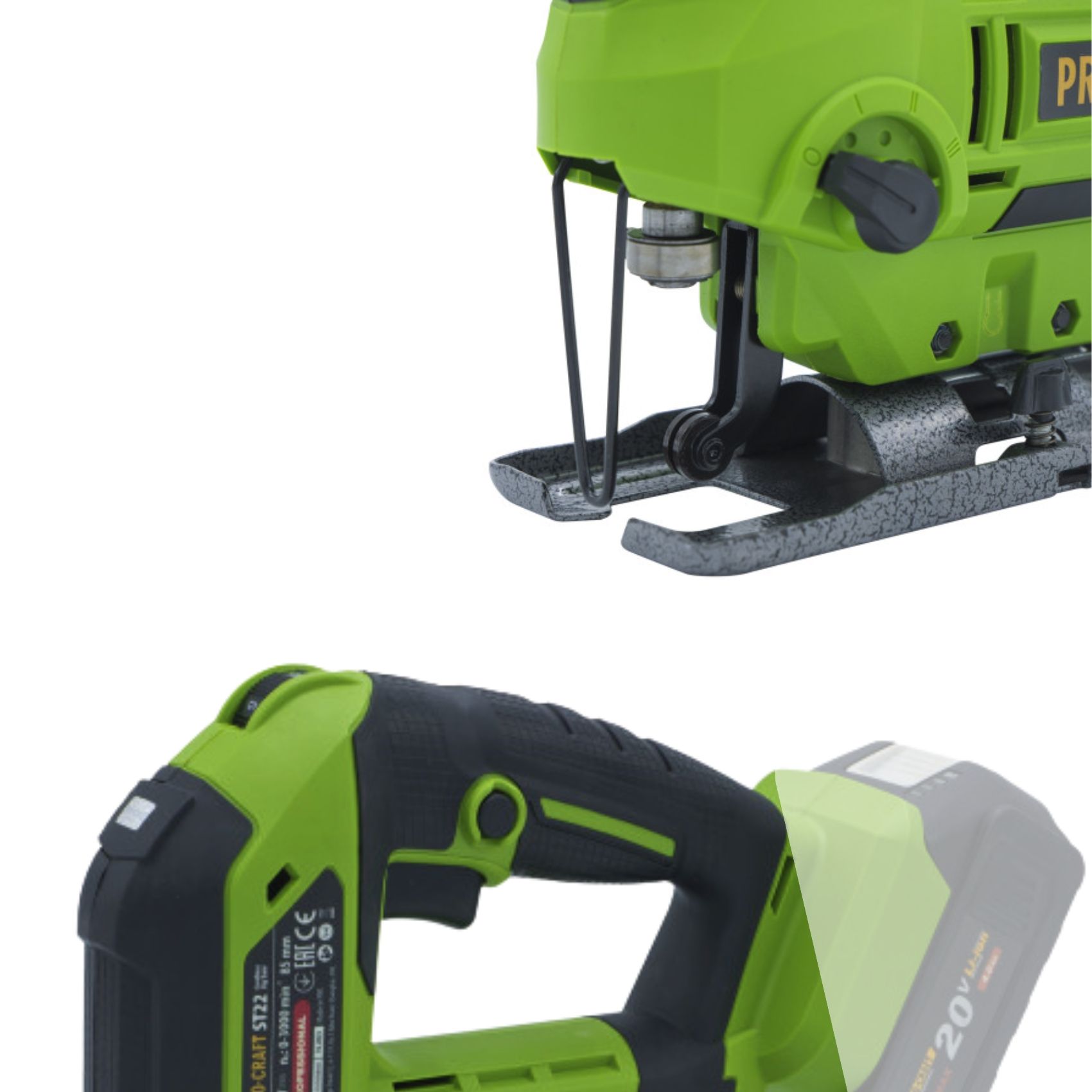 Основные преимущества аккумуляторного лобзика Procraft ST22: безщеточный двигатель для продуктивной работы, аккумуляторное питание для высокой мобильности, точность резки благодаря ходу пилки 22 мм, скорость работы до 3800 оборотов/мин, легкий вес для удобства работы.