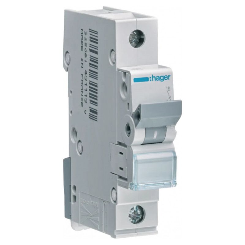 Автоматический выключатель (АВТ) HAGER MCN116A, 1-полюсный, с номинальным током 16 А, характеристикой износа типа C и выключающей способностью 6 кА. Имеет модульное исполнение на 1 модуль.