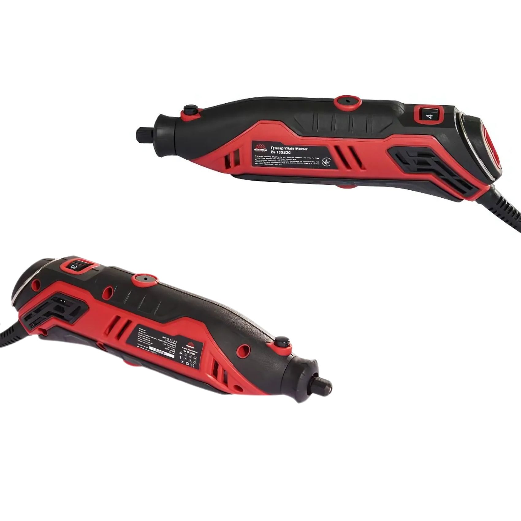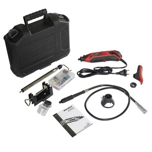 Важной особенностью этого электроинструмента является большая скорость вращения холостого хода, что обеспечивает отличную производительность и качество работы. Скорость вращения холостого хода регулируется колесом-регулятором в пределах 10000–35000 об/мин. Большая скорость вращения позволяет выполнять точные работы. Устройство оснащено специальной кнопкой, которая при необходимости быстро остановит шпиндель. Для надежной фиксации рабочих насадок используются цанги: 2,3; 3,2 мм.