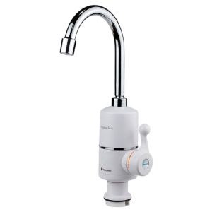 Компактный электрический проточный водонагреватель для кухни с изогнутым гусям типа «ухо» на гайке. Обеспечивает быстрый нагрев воды до комфортной температуры без установки бойлера. Оснащен защитой от влаги по стандарту IPX4 и предназначен для подключения к обычной бытовой электросети.