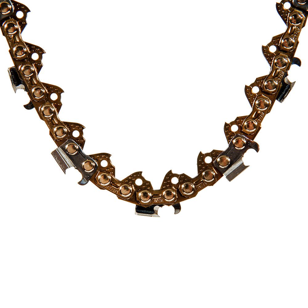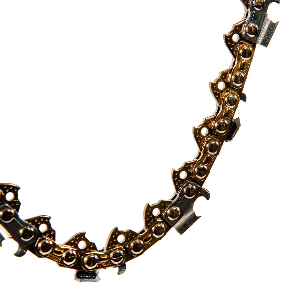 Изготовлен из легированной каленой стали повышенной прочности, цепь устойчива к износу, перегреву, деформациям и коррозии даже во время длительного использования. Режущие зубцы из стали 68CrNiMo отличаются высокой жесткостью и долговечностью, долго сохраняя остроту без надобности частой заточки.