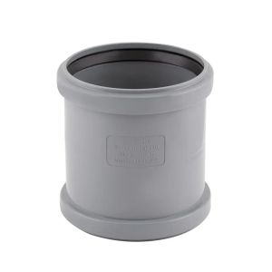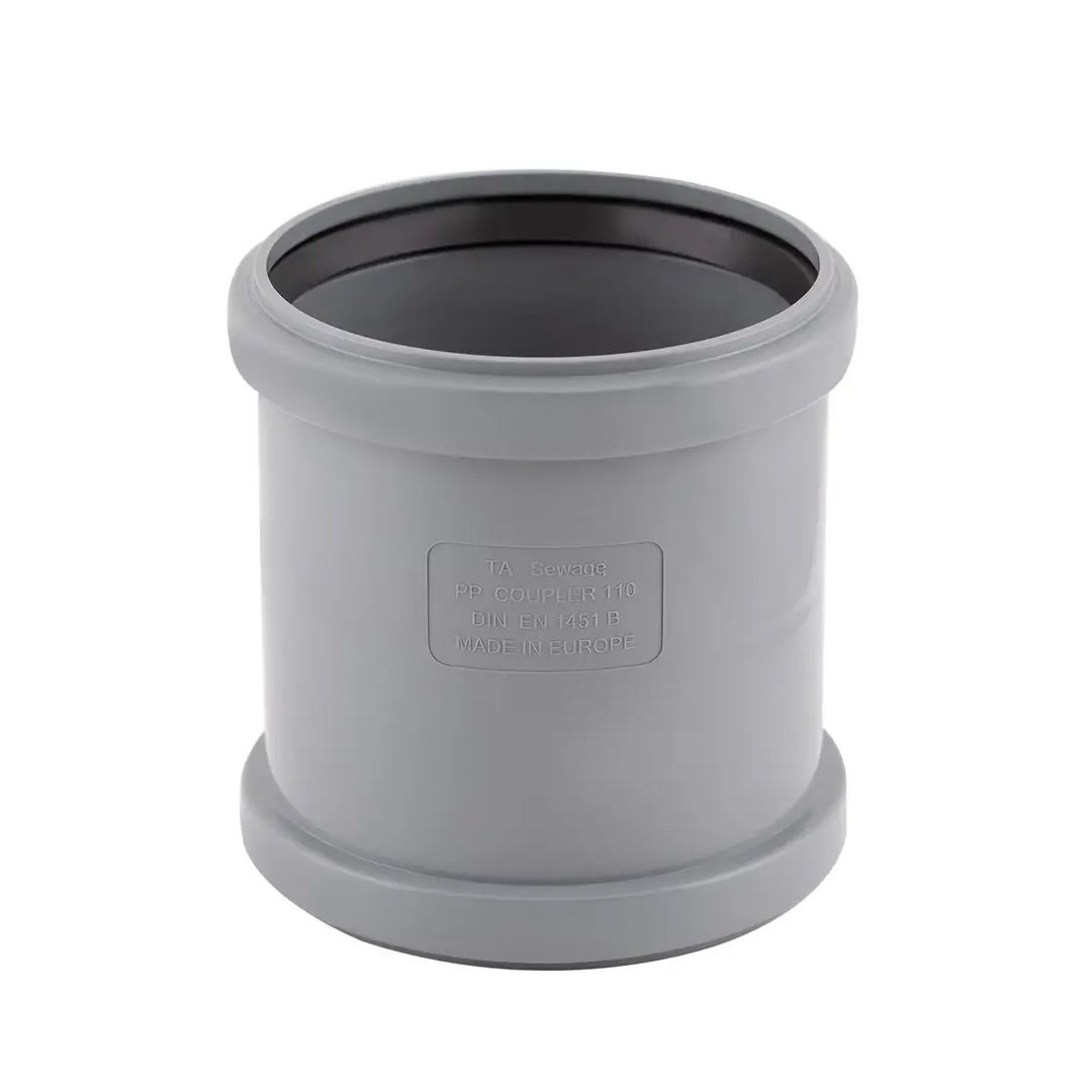Эта муфта предназначена для использования в системах канализации для соединения двух труб диаметром 110 мм.
