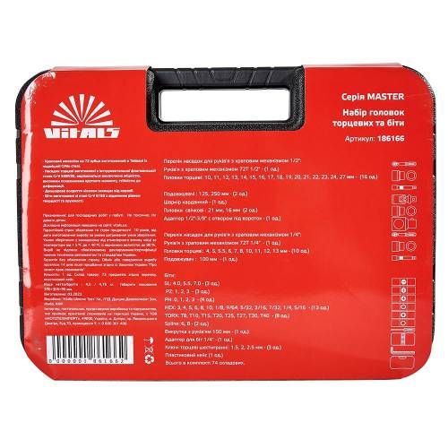 Набор головок торцевых 1/4″ и 1/2″ 73 предмета Vitals Master предназначен для использования в автосервисах, гаражах, промышленных предприятиях, а также для домашнего использования. Его можно использовать для откручивания и затягивания гаек и болтов разной метрики в автомобилях, мотоциклах, скутерах, хозяйственной технике, садовой технике и других механических устройствах.