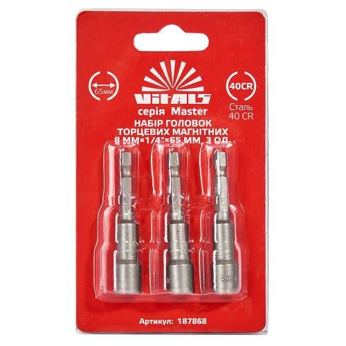 Набор головок торцевых магнитных 8 мм 1/4″×65 мм 3 шт. Vitals - это набор высококачественных головок, разработанных для ремонта и обслуживания различных механизмов и машин. Изготовлены из высокопрочной стали 40CR, эти головки гарантируют высокую прочность и долговечность. Благодаря длине 65 мм, они обеспечивают удобный доступ к труднодоступным местам. Рабочий размер 8 мм соответствует потребностям многих ремонтных работ. Посадочный квадрат размером 1/4" гарантирует надежное крепление головки на гайковерт. Этот набор головок является незаменимым инструментом для любого профессионального мастера или просто для собственного домашнего ремонта.