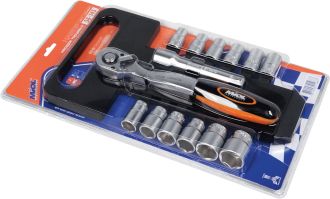 Набор имеет 15 насадок разных размеров, что позволяет удобно выполнять ремонтные работы на автомобилях. Также в наборе есть удлинитель для работы в труднодоступных местах.