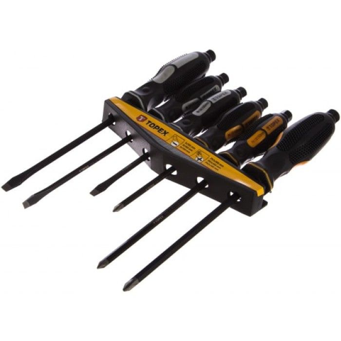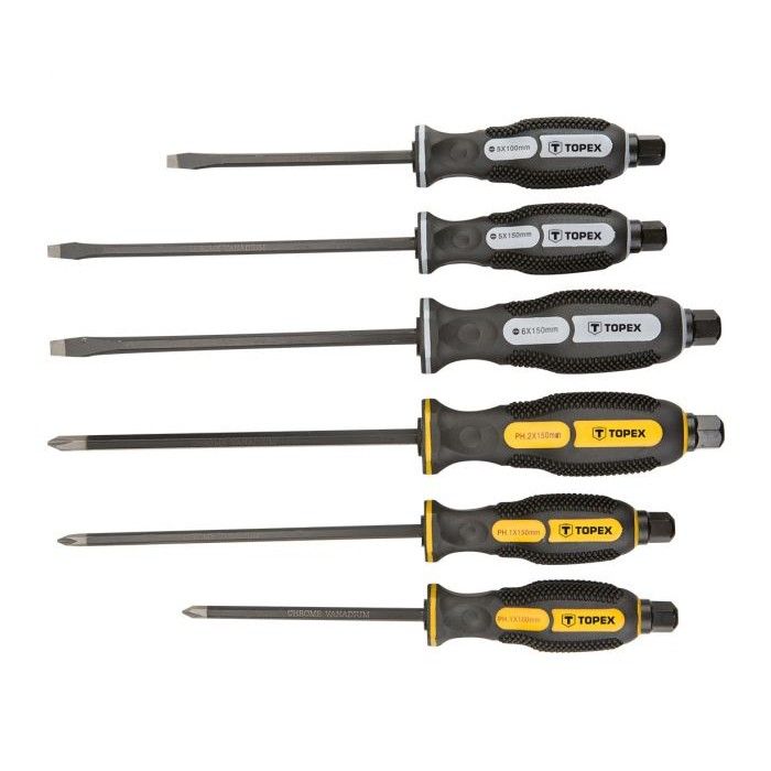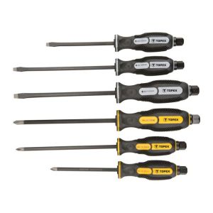 Набор ударных отверток Topex (6 шт.) - незаменимый инструмент для любого мастера или любителя в домашних условиях. Отличное сочетание качества и доступной цены делает этот набор очень популярным среди покупателей. Он состоит из 6 штук отверток с различными насадками, которые позволяют удобно и быстро выполнять работы с креплениями разного типа. Благодаря специальному покрытию, отвертки обеспечивают надежное сцепление с креплением и предотвращают его повреждение. Ручки удобно лежат в руке, не скользят и не утомляют во время использования. Приобретя этот набор, вы получите необходимые инструменты для проведения ремонтных работ или сборки мебели.