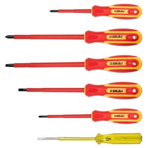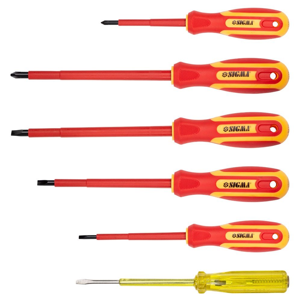 Набор диэлектрических отверток SIGMA 4001071 содержит 5 отверток и индикатор отвертки 250 В. Инструменты изготовлены из стали CrV и имеют изоляционное покрытие, которое защищает при работе с электросетью. Предназначены для монтажных и ремонтных электротехнических работ.