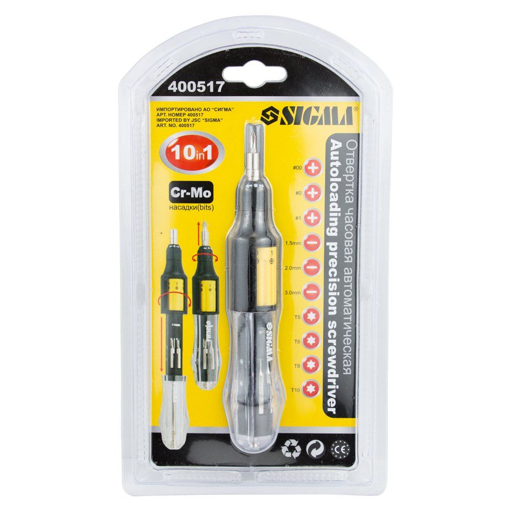 Набор отверток SIGMA 4003071 состоит из рукоятки и 10 сменных бит с системой автоматической замены. Инструменты изготовлены из стали CrV, что обеспечивает долговечность и удобство в работе с мелкими механизмами и электроникой.