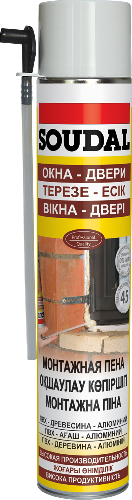 Расширение: Пена монтажная SOUDAL 750 мл обладает свойством мощно расширяться, что позволяет заполнять неровности и щели, обеспечивая герметичную и теплоизоляционную функцию.