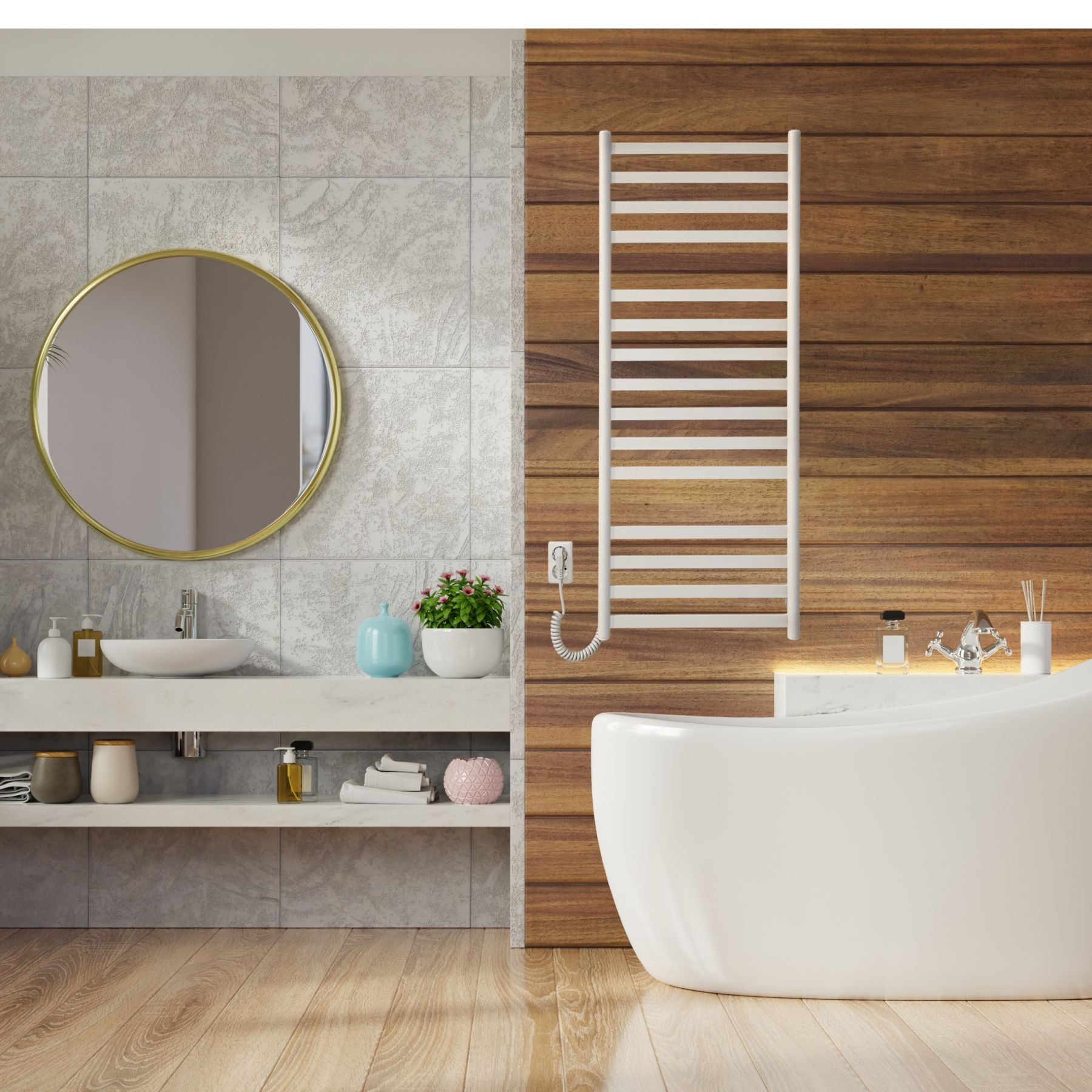 Сухой ТЭН обеспечивает быстрый прогрев и поддерживает стабильную температуру 60 ± 5°C при низком энергопотреблении. Управление производится с помощью удобной кнопки включения/выключения, что делает использование простым и комфортным. Двойной вывод питания дает возможность подключения с любой стороны, а комплект скрытого монтажа помогает сохранить аккуратный вид стены.