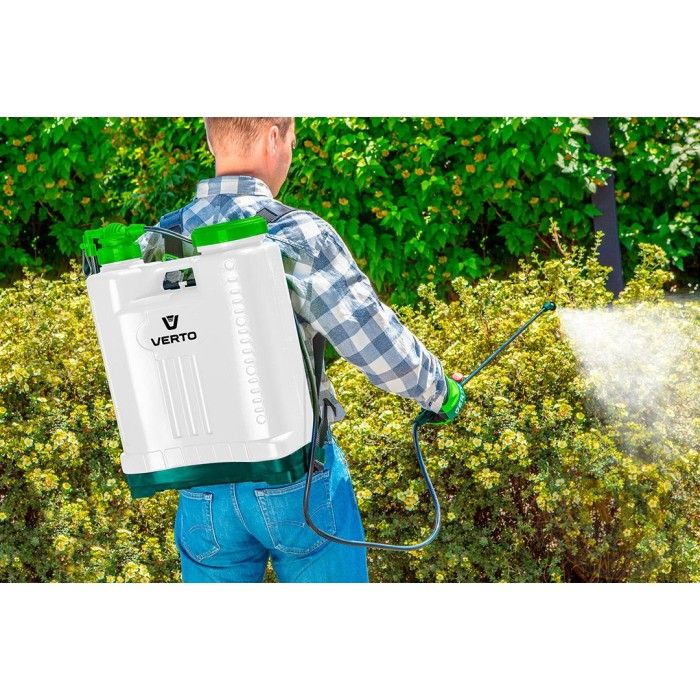 Преимущества садового помпового опрыскивателя Verto включают в себя большой объем бака, прочный корпус, удобную ручку для переноски, а также высокое качество обработки растений и простоту в эксплуатации.