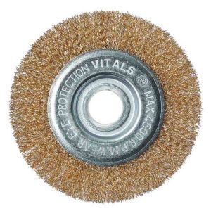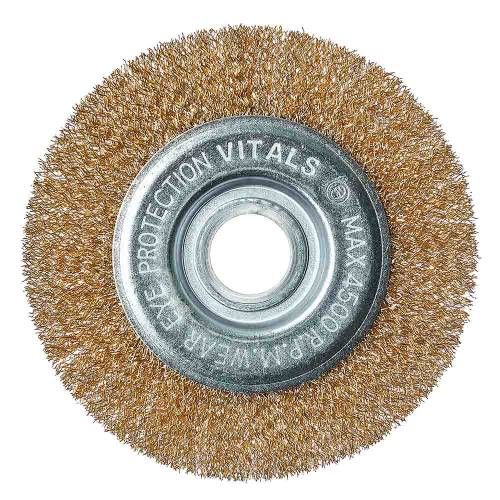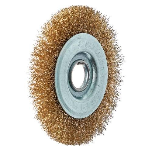 Щетка дисковая Vitals гофрированная латунированная 125×22,2 м, 0,3 мм предназначена для обработки деревянных и металлических конструкций в труднодоступных местах, снятия краски, ржавчины, лака, обработки сварных швов.