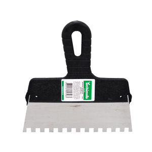 Малярный шпатель Yoshimoto Y03-041 из нержавеющей стали с пластиковой ручкой предназначен для нанесения клеевых растворов при укладке плитки, газобетонных блоков и утеплителей. Зуб 8×8 мм и ширина полотна 150 мм делают его удобным для плитки до 20-40 см. Зубчатая форма позволяет равномерно распределять раствор.