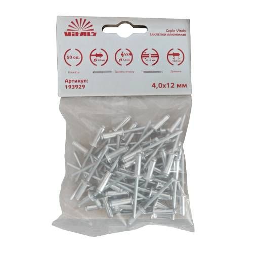 Преимущества алюминиевых заклепок Vitals 4.0x12 мм (50 шт.): - Высокая прочность и долговечность - Устойчивость к коррозии - Легкий монтаж - Универсальное применение - Экономическое решение для соединения деталей