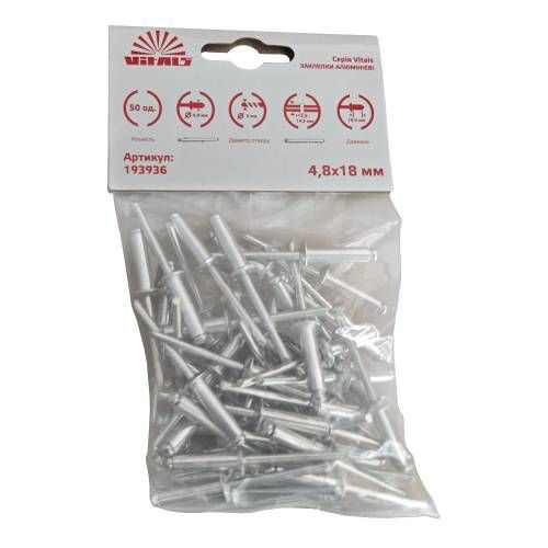 Алюминиевые заклепки 4.8x18 мм (50 шт.) Vitals - важный элемент при проведении строительных, монтажных, технических и ремонтных работ. Они используются для соединения двух или более слоев материала. Заклепки имеют длину 18 мм и диаметр 4,8 мм. Изготовлены из высококачественного алюминия, что обеспечивает их прочность и стойкость к коррозии.