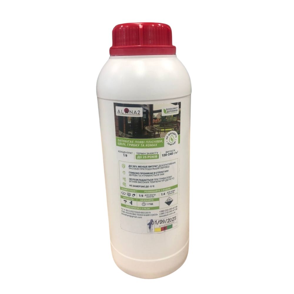 Средство биозащитное АЛАНА-2 концентрат 1:9 (красный, 1 кг) – водорастворимый антисептический концентрат для древесины, предназначенный для защиты от грибков, плесени, насекомых и биологического разрушения. Содержит красный цветовой индикатор для контроля равномерности нанесения. Подходит для внутренних и наружных работ без контакта с грунтом.