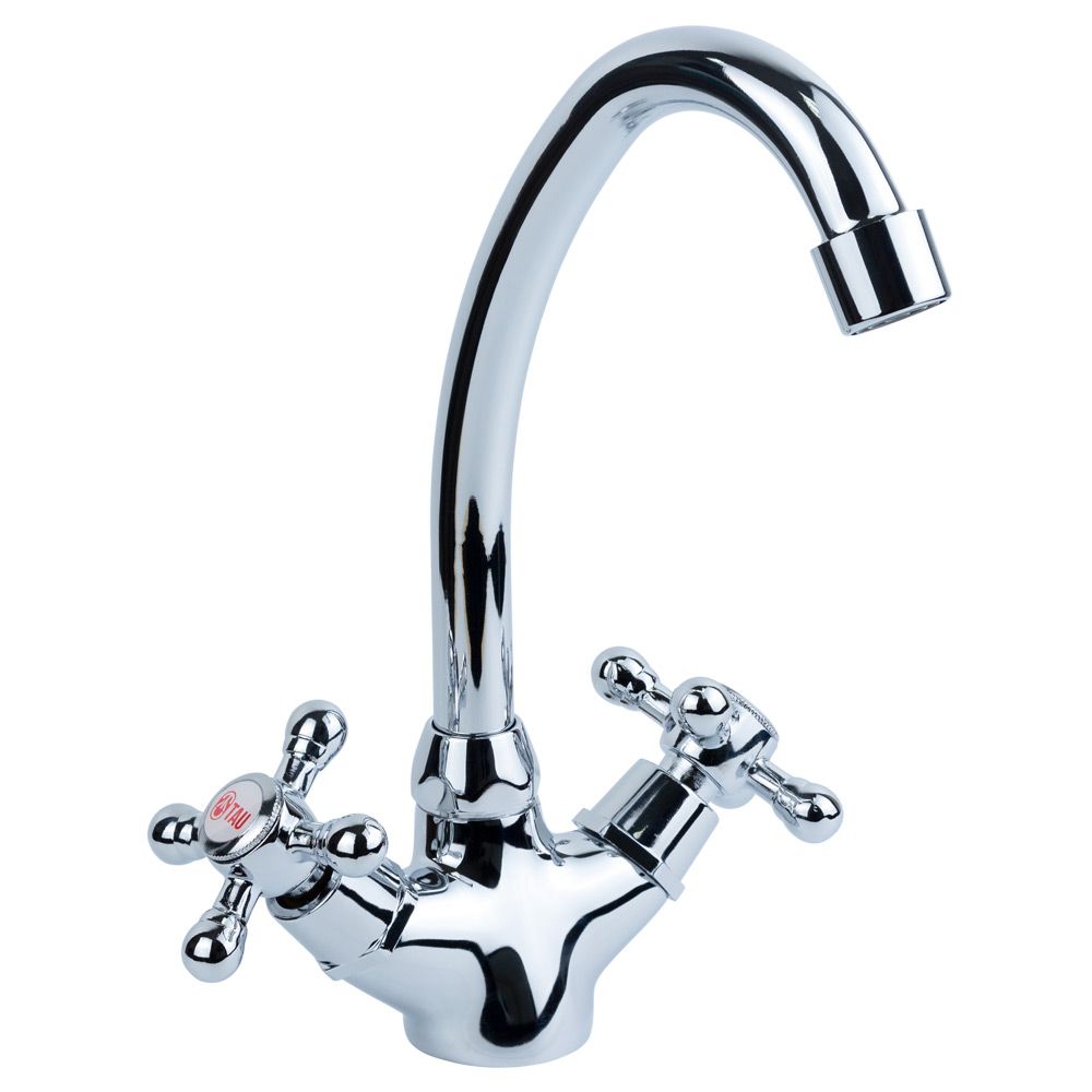 Двухвентильный смеситель для кухни с J-образным поворотным изливом высотой 245 мм. Встроенный аэратор обеспечивает стабильный и равномерный поток воды, а хромоникелевое покрытие защищает корпус от коррозии, повреждений и потери блеска. Вентили с керамическими дисками оснащены цветными заглушками для удобного обозначения горячей и холодной воды.