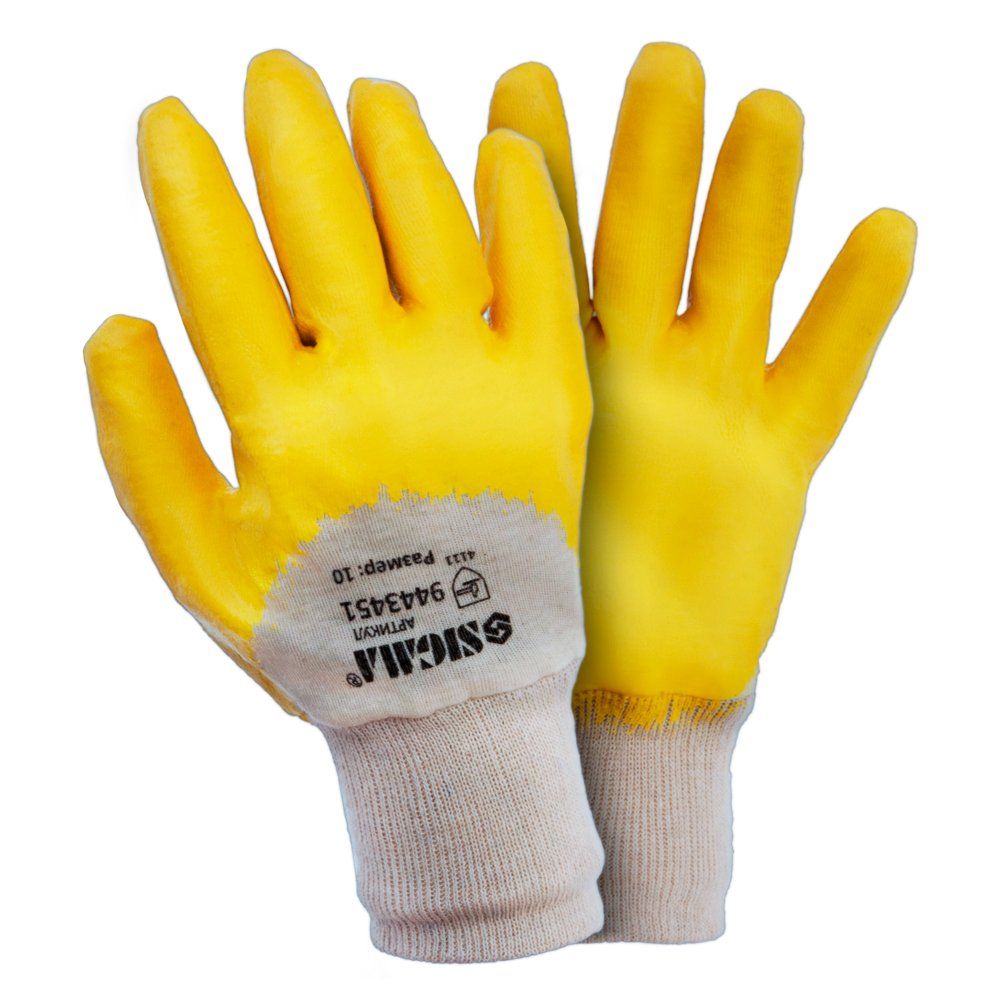 Рукавички трикотажні з нітриловим покриттям (жовті) 120 пар SIGMA (9443451) призначені для захисту рук від впливів масел, жирів, нафтопродуктів, а також механічних впливів.