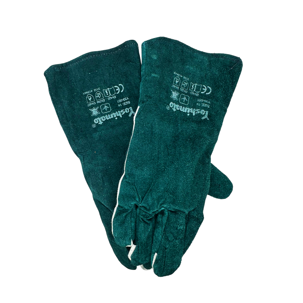 Бренд: YoshimotoТип: зварювальні рукавичкиматеріал: коров’яча замша (натуральна шкіра)Колір: темно-зеленийМанжета: подовжена (крага)Розмір: 11 (XXL)Призначення: зварювання, робота з гарячими поверхнями, грубі монтажні роботиЗахист від: порізів, механічних пошкоджень, іскор, жаруТемпературна стійкість: до короткочасного впливу високих температур