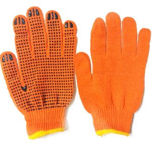 Робочі рукавички виготовлені з міцного бавовняного волокна з додаванням синтетичної нитки, що забезпечує зручність і довговічність. Долонна частина покрита ПВХ-точками, які покращують зчеплення та запобігають ковзанню при роботі зі слизькими поверхнями.