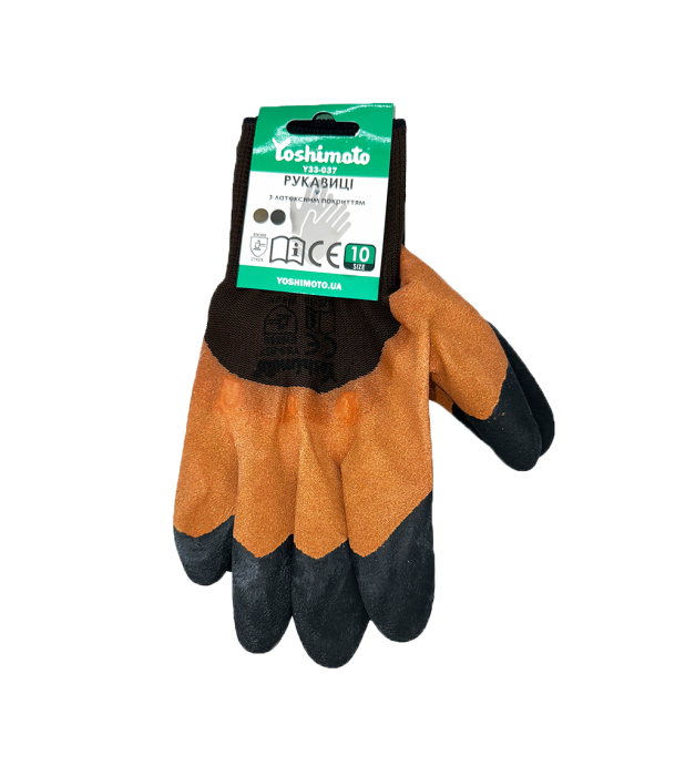 Захисні рукавички Yoshimoto виконані з подвійним коричнево-чорним латексним покриттям, яке забезпечує високу зносостійкість і надійний захист від механічних пошкоджень. Завдяки вспіненому латексу долоня залишається м’якою та комфортною під час роботи, а ущільнені пальці гарантують додаткову міцність і стійкість до стирання.