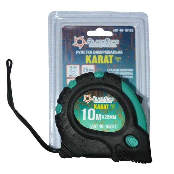 Рулетка 'Black Star' 10м*25мм КАРАТ ідеально підходить для використання в будівництві, ремонті, внутрішніх та зовнішніх робіт. Завдяки своїм характеристикам вона забезпечує точність та зручність під час вимірювальних робіт.