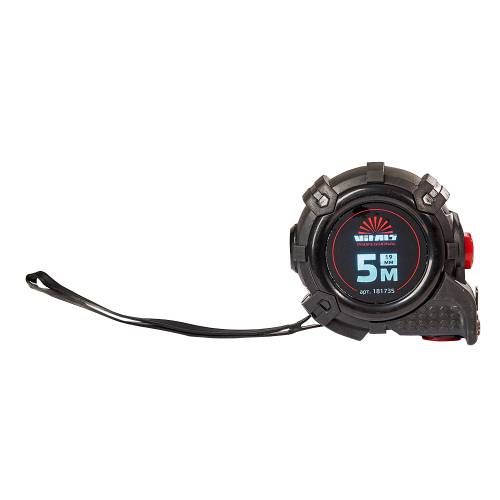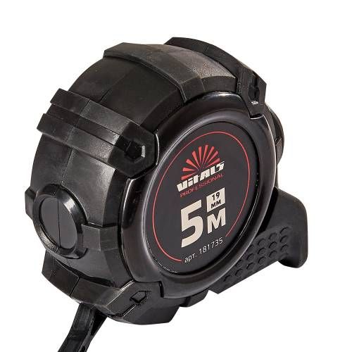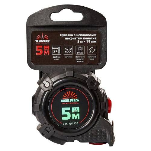 Рулетка гумова з нейлоновим покриттям полотна 5 м 19 мм автостоп Vitals Professional - ідеальний інструмент для точного вимірювання відстаней. Вона має надійний корпус з АБС-пластика з гумовим покриттям, що забезпечує комфортний захоп і захищає рулетку від пошкоджень. Довжина стрічки - 5 метрів, ширина - 19 мм, що дозволяє зручно вимірювати різні розміри і відстані. Металевий автостоп зупиняє рулетку і утримує її на потрібній відстані. Ця рулетка є надійною та зручною у використанні, ідеально підходить для будівельних та ремонтних робіт.