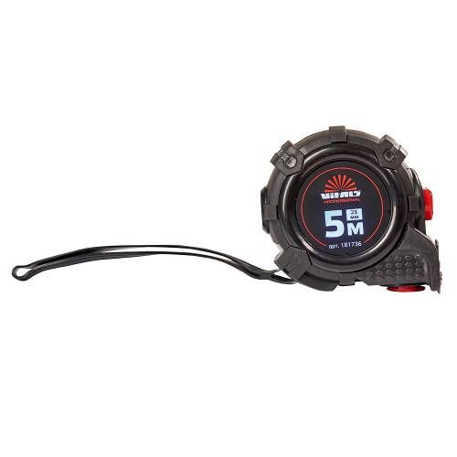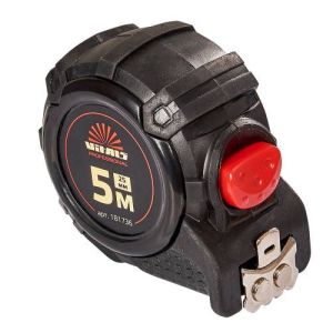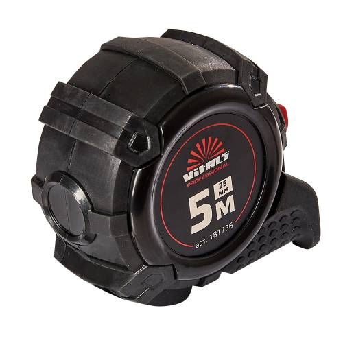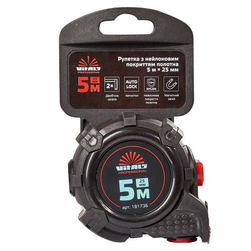 Рулетка гумова з нейлоновим покриттям полотна 5 м 25 мм автостоп Vitals Professional підходить для вимірювання відстаней та розмірів у будівельній справі, ремонті та в широкому спектрі домашніх завдань.