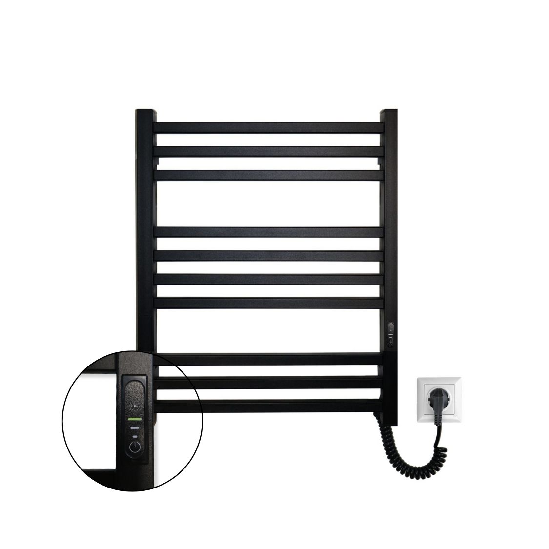 Сучасний сухий ТЕН забезпечує швидкий нагрів та рівномірний розподіл тепла. Інноваційний контролер дозволяє обрати один із температурних режимів 45°C, 55°C або 60°C ± 5°C, встановити таймер на 2, 4 або 6 годин чи обрати безперервну роботу. Подвійний вивід живлення надає гнучкість при монтажі, а комплект прихованого підключення допомагає зберегти охайність стіни.