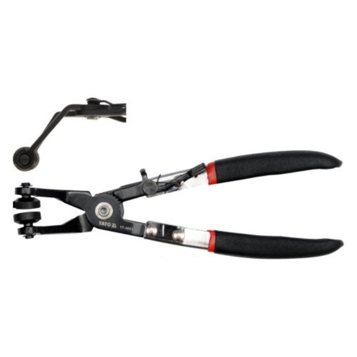 Вигнуті щипці для розширювальних затискачів, 215 мм — інструмент для роботи з хомутами діаметром від 4 до 12 мм. Завдяки вигнутій формі та робочому куту 45, зручно працювати у важкодоступних місцях.
