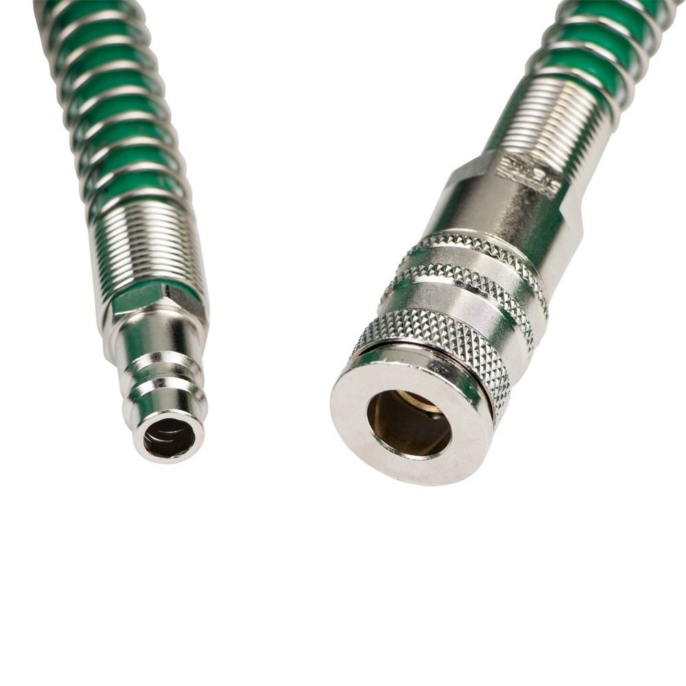 Завдяки еластичності та міцності шланг зберігає внутрішній прохідний діаметр навіть при згинах. Оснащений посиленими сталевими швидкороз’ємними з’єднаннями, що забезпечують швидке та надійне підключення до компресора чи пневмоінструменту.